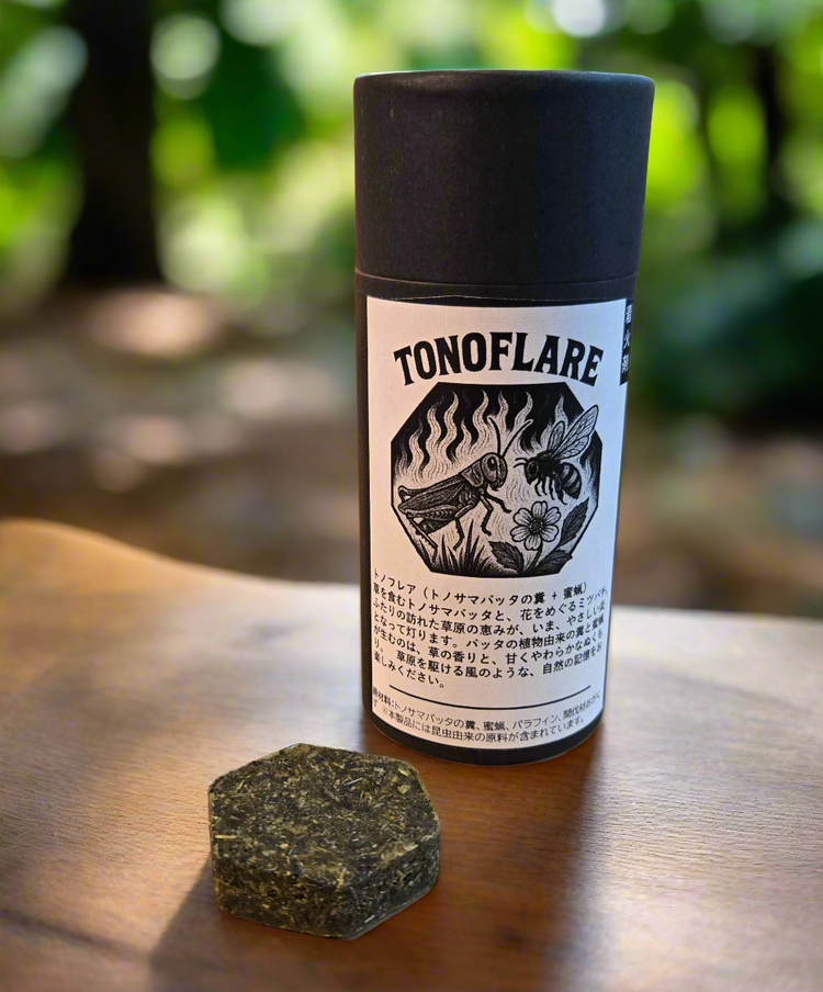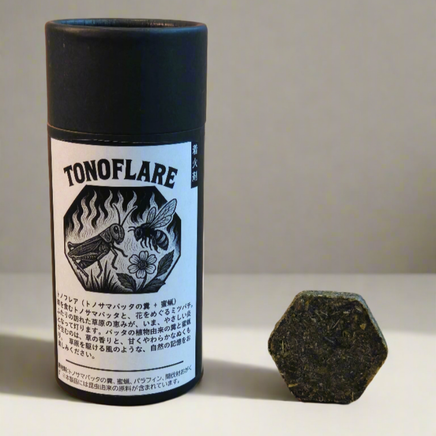 TONOFLAREは、草食性の昆虫が出す植物由来の糞天然蜜蝋を主原料とした、人にも環境にもやさしいナチュラルな着火剤です。